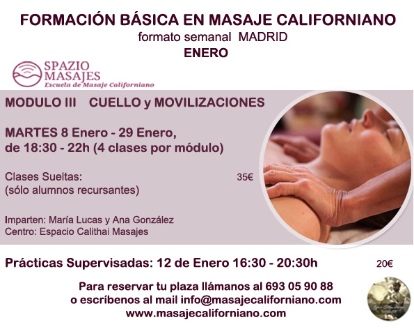 ENERO: FORMACIÓN MASAJE CALIFORNIANO nivel básico 26 diciembre, 201822 diciembre, 2018 por calithai, posted in Agenda Continuando con el formato semanal el próximo Martes 8 de Enero comenzaremos el Módulo III del Nivel Básico, estas clases están abiertas a aquellos recursantes que quieran repasarlo, bien completo o alguna clase puntual. Os esperamos! Compartir en Facebook (Se abre en una ventana nueva) Facebook Compartir en X (Se abre en una ventana nueva) X Email a link to a friend (Se abre en una ventana nueva) Correo electrónico Compartir en WhatsApp (Se abre en una ventana nueva) WhatsApp Relacionado