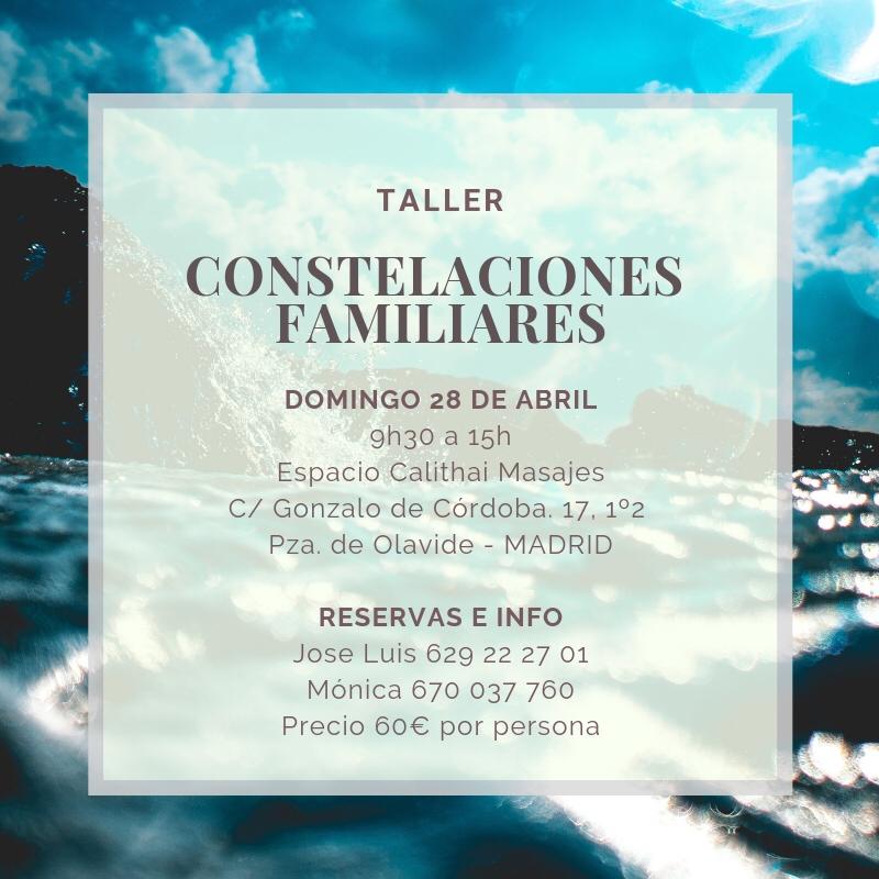 ABRIL: CONSTELACIONES FAMILIARES 5 abril, 20193 abril, 2019 por calithai, posted in Agenda Taller de Constelaciones Familiares Domingo 28 de Abril, de 9.30 – 15h Precio: 60€ Lugar: Espacio Calithai c/ Gonzalo de Córdoba, 17 (Madrid) +Info y Reservas Mónica 670.037.760 Jose Luis 629.222.701 Compartir en Facebook (Se abre en una ventana nueva) Facebook Compartir en X (Se abre en una ventana nueva) X Email a link to a friend (Se abre en una ventana nueva) Correo electrónico Compartir en WhatsApp (Se abre en una ventana nueva) WhatsApp Relacionado