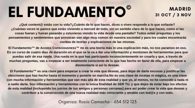 NOVIEMBRE: El Fundamento 31 octubre, 2019 por calithai, posted in Agenda EL FUNDAMENTO ¿Eliges renacer? Cuatro intensos días de Facilitación con Preguntas y herramientas de Access, de la mano de Fernando Diego 31 OCT / 3 de NOV Horario de 10 a 19h ESPACIO CALITHAI MASAJES C/ Gonzalo de Córdoba, 17 Oficina B MADRID Info y Reservas Rocío Camacho: 634 512 123 Compartir en Facebook (Se abre en una ventana nueva) Facebook Compartir en X (Se abre en una ventana nueva) X Email a link to a friend (Se abre en una ventana nueva) Correo electrónico Compartir en WhatsApp (Se abre en una ventana nueva) WhatsApp Relacionado