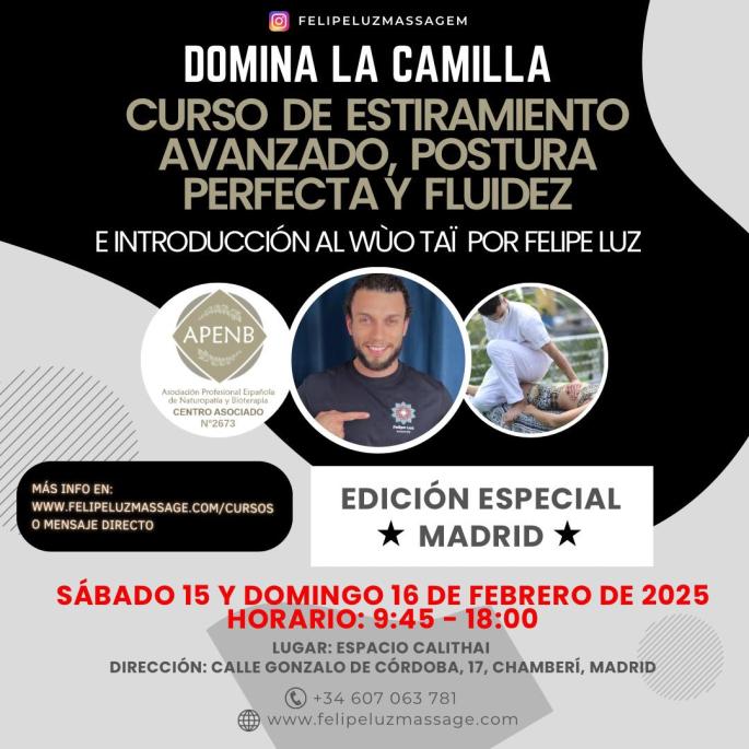 Estiramientos avanzados en camilla e introducción al Wùo Taï Por primera vez tenemos en nuestra sala este curso de especialización en estiramientos en camilla de Felipe Luz. Aprender sobre estiramientos intermedios y avanzados, movilidad articular y técnicas de acupresión e introducirte en la práctica francesa Wúo Tai (Osteo-Danse) te dará herramientas para potenciar la creatividad … Sigue leyendo FEBRERO: Estiramientos en camilla e introducción al Wùo Taï