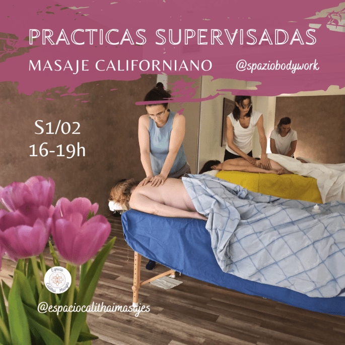 Practicas Supervisadas masaje californiano Dirigido a todos los alumnos del Institute Bodybork @spaziobodywork (anterior Escuela Spazio Masajes) que han cursado el Nivel Básico, Intermedio o Avanzado. Aprovecha esta oportunidad de seguir expandiendo tu práctica y tu red de vínculos con la familia californiana, dentro de este espacio de encuentro para afinar tu masaje y resolver … Sigue leyendo FEBRERO: Prácticas Supervisadas de MASAJE CALIFORNIANO