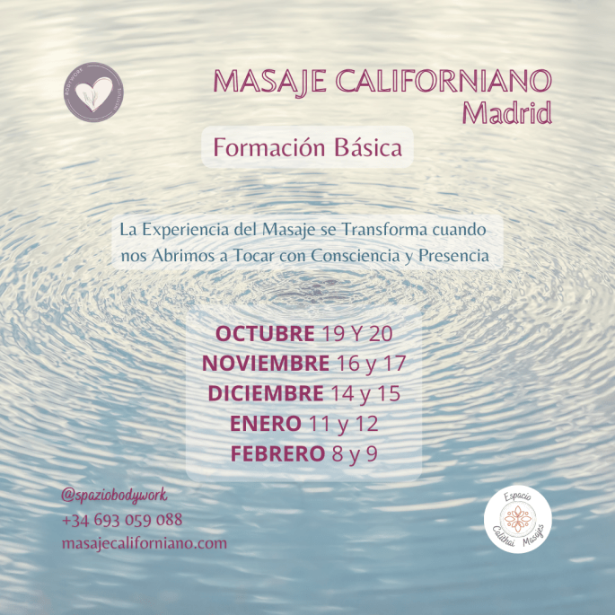 Masaje Californiano nivel básico Este mes llegamos al último módulo de la Formación Básica de Masaje Californiano del Institute Bodywork. Durante esta travesía de 5 fines de semana unimos corazón y contacto en una danza única. Hemos explorado a través de ejercicios, nuestra capacidad de presencia, conexión y por supuesto hemos traído el baile a … Sigue leyendo FEBRERO: Aprende MASAJE CALIFORNIANO en Madrid – Módulo Final