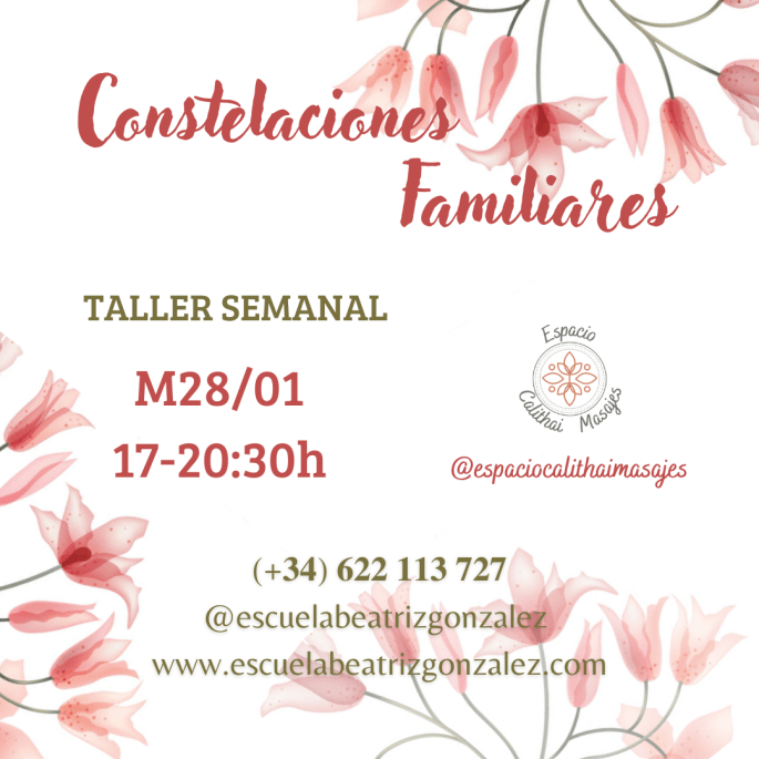 CONSTELACIONES FAMILIARES Las Constelaciones Familiares son una herramienta terapéutica poderosa para comprender y liberar los bloqueos en tu vida. A través de representaciones físicas, se manifiestan los nudos y bloqueos presentes en tu inconsciente, relacionados con aspectos como relaciones afectivas, enfermedades, profesión y más. El taller revela un "mapa" de cómo está estructurado un aspecto … Sigue leyendo ENERO: Taller Semanal CONSTELACIONES FAMILIARES