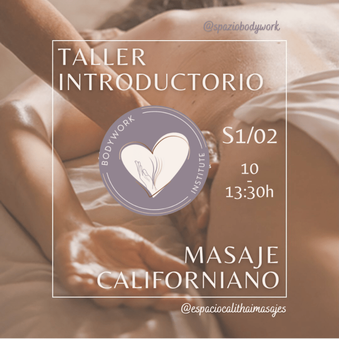 Taller promOcional Masaje Californiano En estetaller introductorio de 3,5 horas vas a conocer las bases del Masaje Californiano, ver una demostración y tener la oportunidad de practicarlo (dar y recibir), siempre supervisado por el equipo de instructora y asistentes. Una oportunidad única para conocer nuestro Institute BodyWork y experimentar en primera persona las bases de … Sigue leyendo FEBRERO: Taller de MASAJE CALIFORNIANO Conexión y Autocuidado