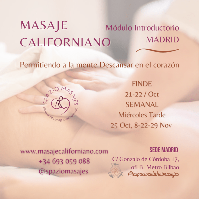 Masaje Californiano MODULO INTRODUCTORIo Un primer acercamiento al Masaje Californiano (necesario para acceder al resto de la formación básica) en el que sumergirnos en la esencia sobre la que se construirá la técnica. ¿Cómo es tocar desde la presencia? El tacto consciente Movimientos Largos Integradores Creando la ola envolvente que caracteriza este masaje. Trayendo el … Sigue leyendo OCTUBRE: Introducción al MASAJE CALIFORNIANO