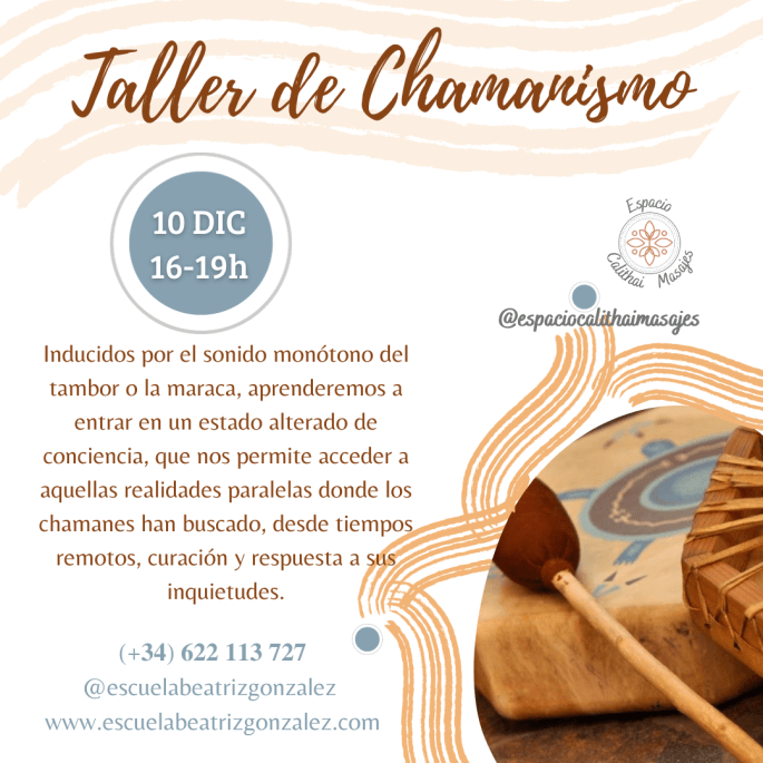 TALLER CHAMANIsmO Un domingo al mes podrás disfrutar de un espacio donde abrirte a las diferentes prácticas chamánicas; que en este momento representan uno de los principales impulsos del despertar espiritual en el mundo occidental. Si bien las tradiciones espirituales modernas tienen su sabiduría y belleza, el chamanismo ha resistido durante milenios las pruebas del … Sigue leyendo DICIEMBRE: Taller Chamanismo