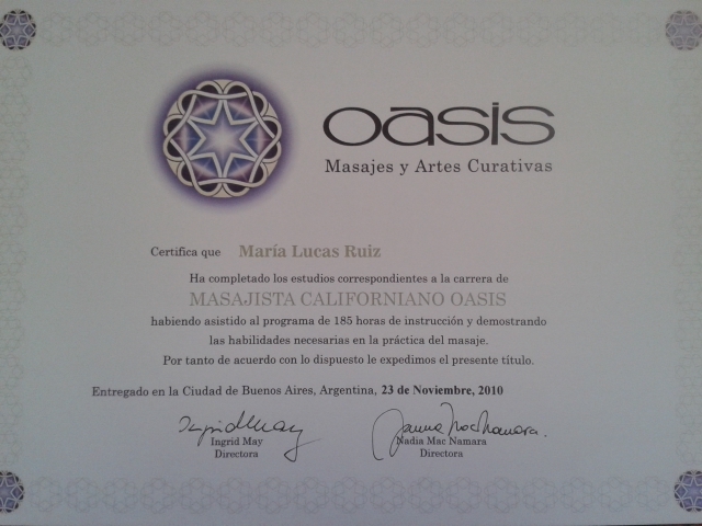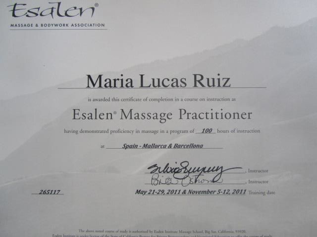 En el año 2010 vuelvo a viajar a Buenos Aires donde busco retomar contacto con la Escuela y profundizo en el masaje a través de la respiración y la meditación. Realizo posteriormente con Ingrid May (creadora de la Escuela de Masaje Californiano Oasis) y Silvia Guersenzvaig (instructora en el Instituto Esalen) la Certificación de Masaje Esalen® celebrada en Mallorca en 2011.